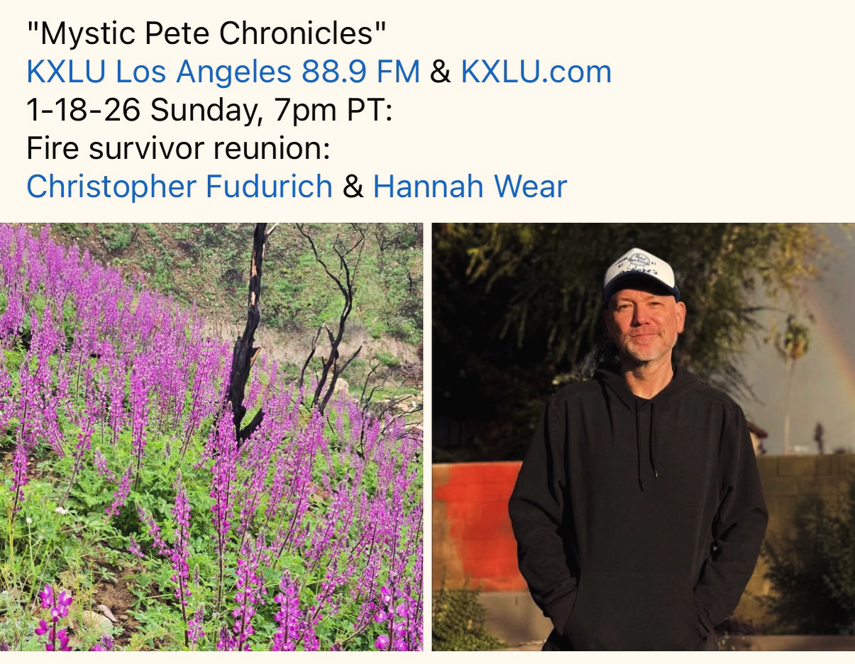 mysticpete2026-01-21 21:40:052026-01-21 23:13:351-18-26 Mystic Pete Chronicles – show 214 – Fire Survivors Hannah Wear & Chris Fudurich
